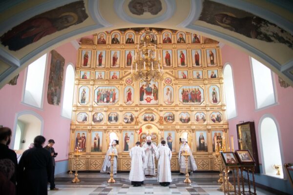 Сегодня молящиеся смогли увидеть уже полностью восстановленный Боголюбский храм – он красиво украшен как снаружи, так и внутри. Во время освящения храма епископом Парамоном было совершено омовение и помазание святого престола, облачение престола и жертвенника, освящение стен храма, а также перенесение и положение под престол и в антиминс святых мощей.