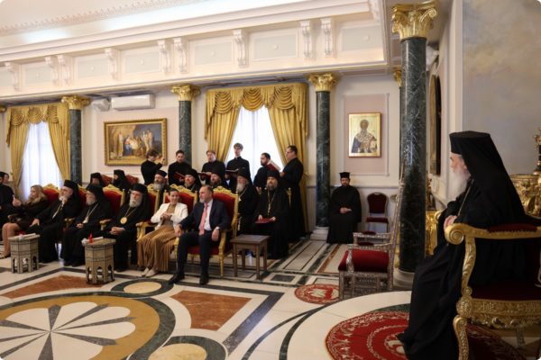 Архимандрит Вассиан передал Блаженнейшему Патриарху Феофилу приветственные адреса Святейшего Патриарха Московского и всея Руси Кирилла и председателя Отдела внешних церковных связей митрополита Волоколамского Антония. Затем начальник и духовенство Миссии лично поздравили Его Блаженство с Пасхой Христовой и передали ему пасхальные подарки и цветы.