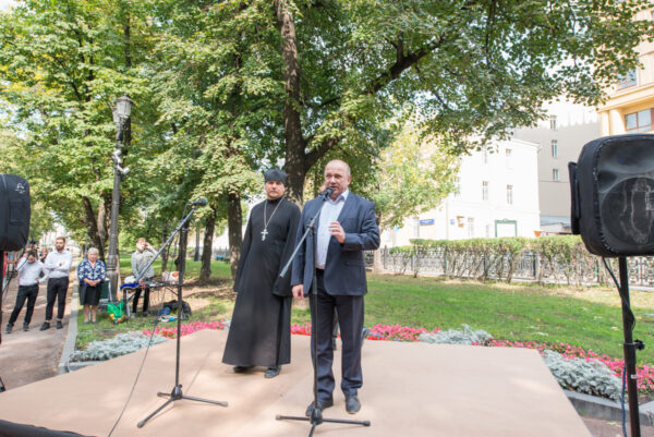 — иерей Максим Глухих, настоятель храма священномученика Серафима (Чичагова), митрополита Петроградского, на привокзальной площади у железнодорожной станции Бутово;