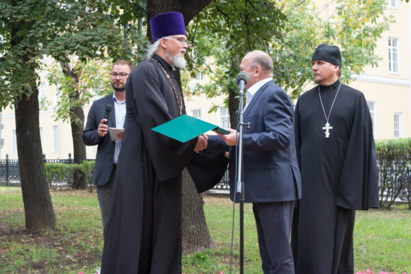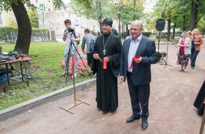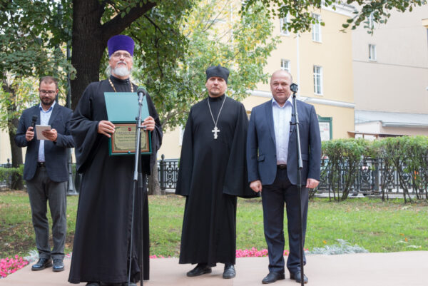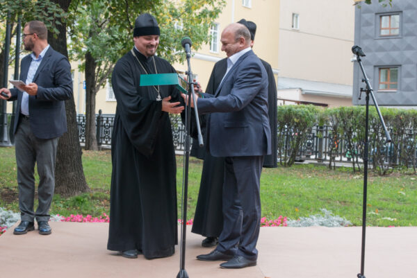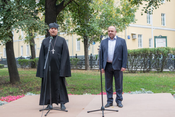 Открывали экспозицию руководитель Департамента национальной политики и межрегиональных связей города Москвы Виталий Иванович Сучков и помощник председателя Финансово-хозяйственного управления Русской Православной Церкви по строительству храмов иерей Александр Привалов.