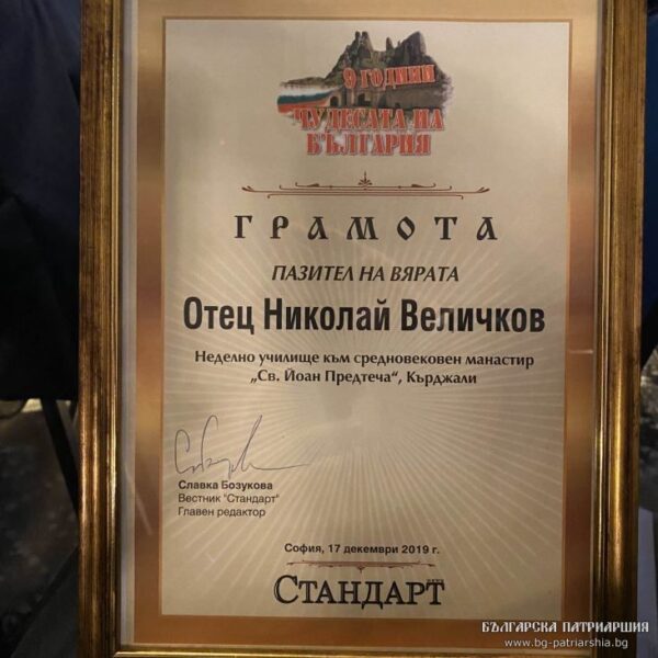 20/12/2019 20/12/2019 За девета година подред кампанията “Чудесата на България” на в. “Стандарт” раздаде своите награди за култура. Една от категориите – “Пазител на вярата и наследството” спечели свещеноиконом Николай Величков, енорийският свещеник при средновековен манастир „Св. Йоан Предтеча“, гр. Кърджали. През 2011 година, с благословението на Високопреосвещения Пловдивски митрополит Николай, неделното училище към средновековния манастир отвори...
