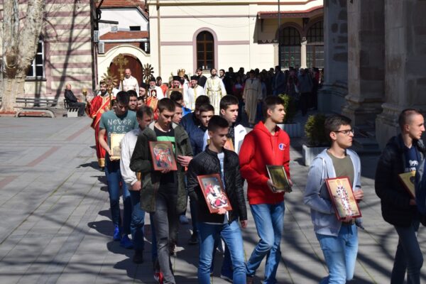 У препуној цркви, учешће у служењу је узела и Нишке црквене певачке дружине Бранко. После читања одељка из светог Јеванђеља, јеромонах Нектарије (Ђурић) одржао је поучну беседу. По заамовној молитви уследио је опход око храма на ком су ученици веронауке из нишке Гимназије Светозар Марковић носили иконе, а затим је прочитан и Синодик који се чита у Недељи Православља.