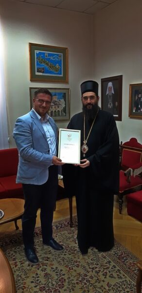 После богослужења, на свечаном пријему у Светосавском дому г. Маријан Мишић, директор Гимназије Светозар Марковић, уручио је Преосвећеном Владики г. Арсенију захвалницу за несебичну подршку ученицима те школе.