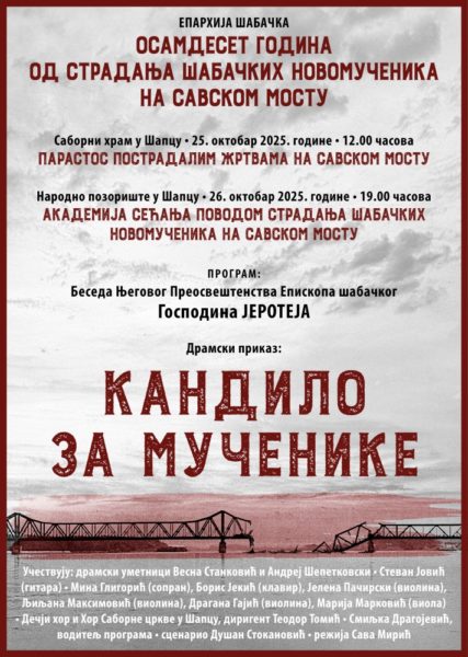 Сутрадан, 26. октобра, са почетком у 19 часова у Народом позоришту у Шапцу биће одржана академија сећања на којој ће беседити Преосвећени Епископ шабачки г. Јеротеј. Уследиће драмски приказ Кандило за мученике.