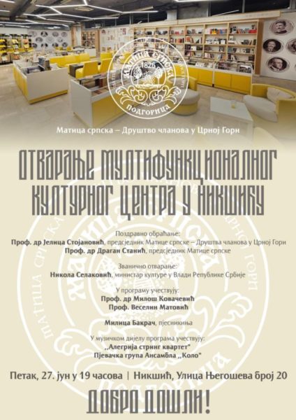 У петак, 27. јуна у 19 часова, у Никшићу, у просторијама Матице српске – Друштва чланова у Црној Гори (Улица Његошева бр. 20), свечано ће бити отворен мултифункционални културни центар Матице српске – Друштва чланова у Црној Гори.