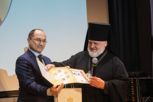 Владыке Назарию Александр Шепелев вручил комплект медалей с изображениями фрагментов жития святителя Николая Чудотворца.