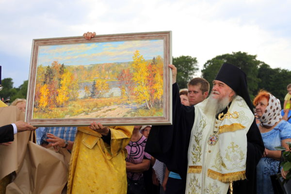 К присутствовавшим обратилась глава Рыбинского муниципального района Татьяна Смирнова. Она поблагодарила владыку Вениамина, Попечительский совет по восстановлению храмового комплекса в Хопылево и всех, кто потрудился в деле возрождения села. В память об этом дне и в год 10-летия Рыбинской епархии глава Рыбинского района вручила епископу Вениамину картину с изображением вида на село Хопылево с правого берега Волги.