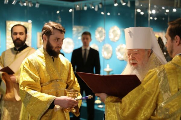 В начале церемонии владыка митрополит совершил молебен по случаю открытия выставки и окропил святой водой помещение, в котором размещается экспозиция. Богослужебные песнопения исполнил хор духовенства Московской областной епархии под управлением священника Сергия Голева.