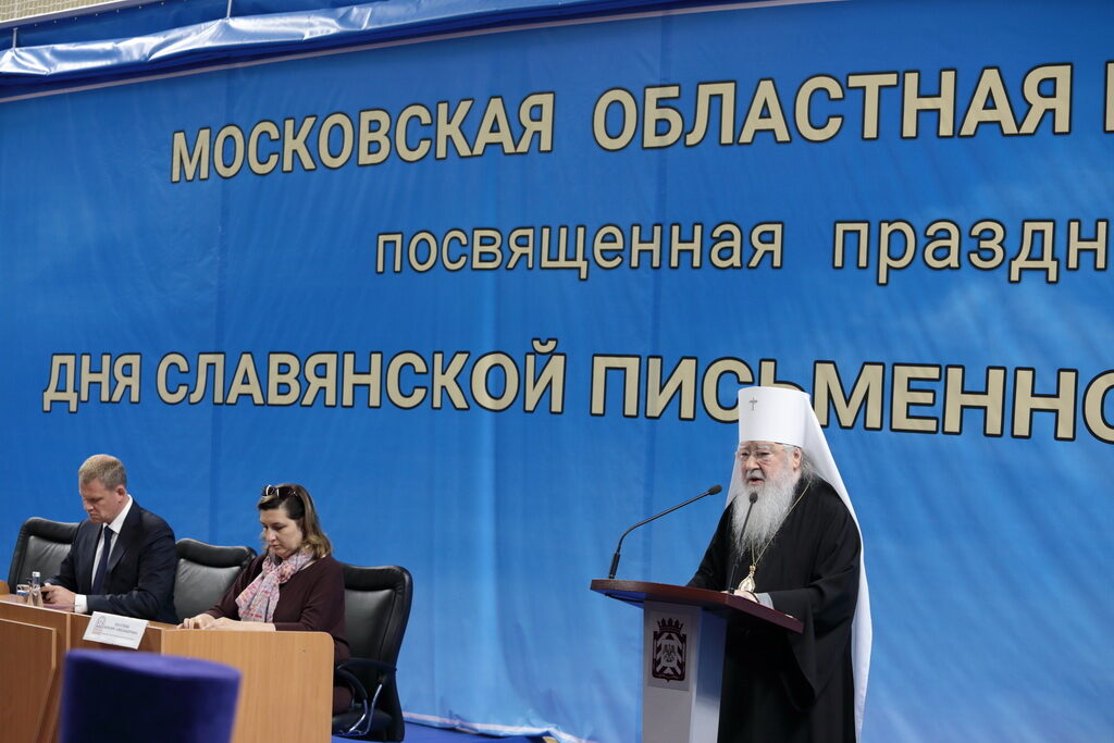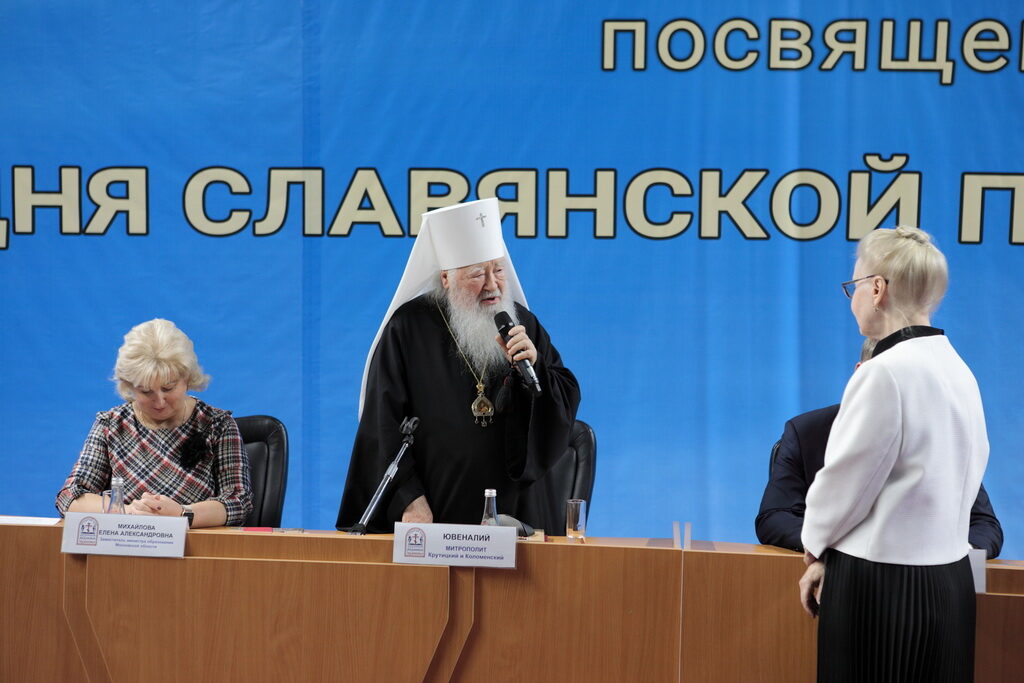 В жизни Церкви и школы есть одно объединяющее обстоятельство. Оно заключается в том, что нарождаются все новые и новые поколения, которые нуждаются в приобщении к знаниям о вере, традиции и культуре. В связи с этим считаю очень важным подчеркнуть, что совместными усилиями наших священнослужителей и педагогов учащиеся должны быть в полной мере просвещены относительно содержания подвига святых Кирилла и Мефодия и значения праздника Дня славянской письменности и культуры. Хочу выразить надежду, что необходимые для этого квалификационные навыки можно приобрести как при содействии нашей Коломенской духовной семинарии, так и в рамках организованной Подмосковным Министерством образования подготовки преподавателей духовно-нравственных дисциплин. Здесь нам всегда будет помощницей и присутствующая здесь профессор Людмила Леонидовна Шевченко.
