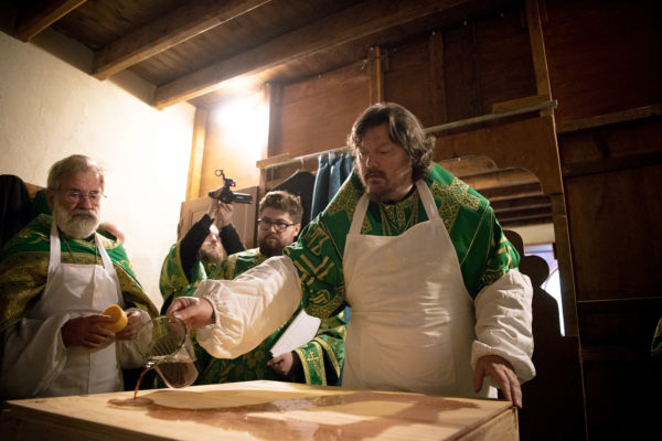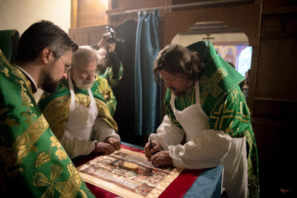 После крестного хода митрополит Нестор, помазав святые мощи миром, вложил их вместе с грамотой об освящении в ковчежец внутри престола и утвердил мастикой. Положение епископом честных мощей в основание святого престола напоминает о том, что Церковь Христова в эпоху гонений была утверждена на мученическом подвиге святых.