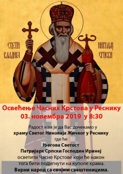 Његова Светост Патријарх српски г. Иринеј началствоваће 3. новембра 2019. године са почетком у 9 часова светом архијерејском Литургијом и освећењем часних крстова у храму у изградњи посвећеном Светом владики Николају Охридском и Жичком у Реснику