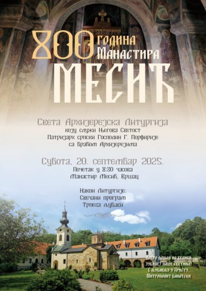 Осам векова манастира Месића код Вршца биће прослављено у суботу, 20. септембра 2025. године, светом Литургијом којом ће началствовати Његова Светост Патријарх српски г. Порфирије са почетком у 8.30 часова. spc.rs