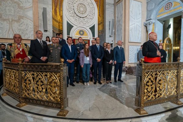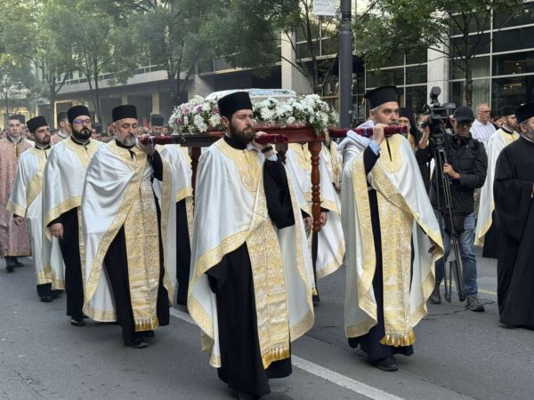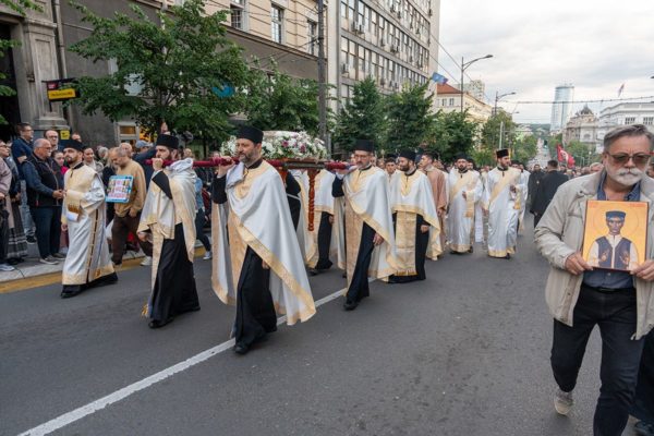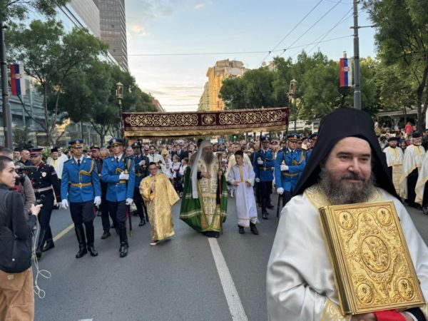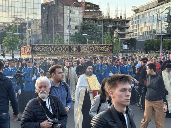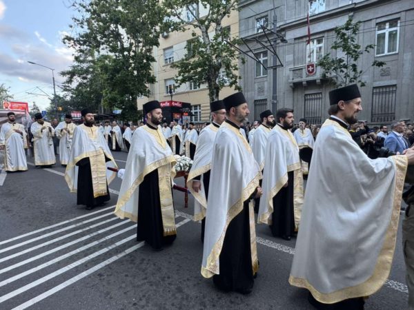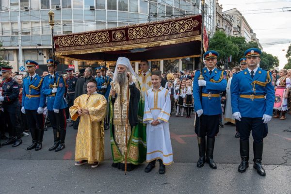 Пошто је прошла улицом Краља Милана, преко Славије до Булевара ослобођења, литију су дочекала звона заветног храма Светог Саве. Хиљаде Београђана који су испунили цркву и Светосавски плато благословио је Његова Светост Патријарх г. Порфирије, који је служио молебан Светом Сави, првом Архиепископу српском, уз молитвено учешће високопреосвећене и преосвећене господе архијереја: милешевског Атанасија, крушевачког Давида, ваљевског Исихија, париског и западноевропског Јустина, умировљеног канадског Георгија, хвостанског Алексеја, новобрдског Илариона, липљанског Доситеја, топличког Петра и моравичког Тихона.