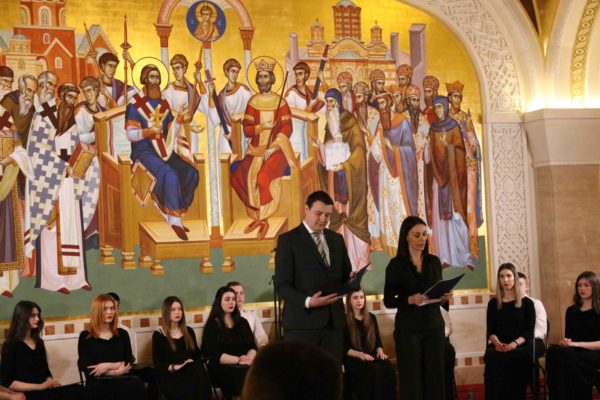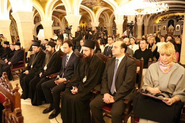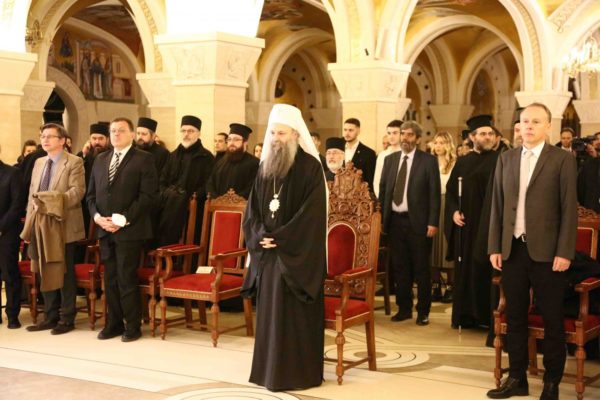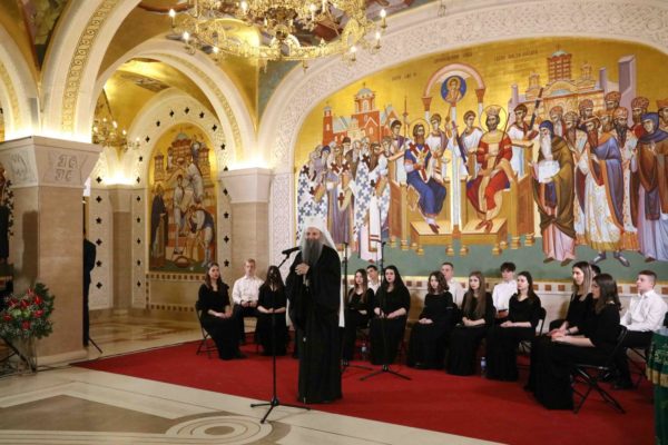 -Ја се радујем што смо се данас сабрали овде под сводовима храма који је посвећен првом просветитељу и учитељу нашем, Светом Сави, на месту где је требало да се затре његово име, да се умањи снага и утицај који је он имао у нашем народу. Ево, десило се по оној јеванђељској да баш онда када изгледа да смо слаби, да су сви устали против нас, да су затрли наше трагове, парадоксално са обзиром да је Свети Сава био везан за Христа читавим својим бићем, показало се да тада постајемо истински снажни, а снага се налазу у парадоксу вере да знање није само фактографија, да се не тиче само створеног света и природе око нас, него да знање надилази оквире физике и улази у оквире метафизике. Када уђемо знањем, тј. вером у просторе метафизике онда и све оно што је антилогично и парадоксално има своје правила, има своје законе, који нама изнутра не само постају јасни него истински блиски. Просвета и образовање имају своје извориште у најважнијој и у највећем броју штампаној књизи, на највише језика превођеној књизи, а то је Библија. Не желим да улазим сада у објашњење те органске везе између просвете и образовања и Библије, онога што нам Библија говори о првом човеку. Само ћу рећи то да је у Библији записано да је човек саздан по образу и подобију Божјем. И ево, већ у корену речи образовање стоји образ, а тај образ тиче се заправо потенцијала који смо добили од Бога и носимо их у себи и треба да их развијамо, да они расту у нама до мере нашег уподобљења Богу. Са друге стране, једна од најважнијих светих тајни Цркве, почетна тајна, тајна крштења зове се просвећење, а то просвећење и просвећивање у тајни крштења тиче се просвећивања нашег унутарњег бића светлошћу Духа Светога. Другим речима, све оно што имамо као своја стечена знања тек онда добија онај истински израз и правни пуни смисао када се доведе у везу са Духом Светим. То значи да када буде у служби из љубави према Богу и љубави према човеку, када буде у служби, како ми то кажемо језиком вере, ближњим.