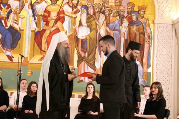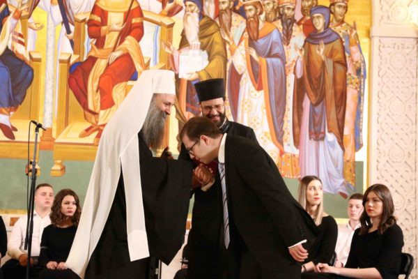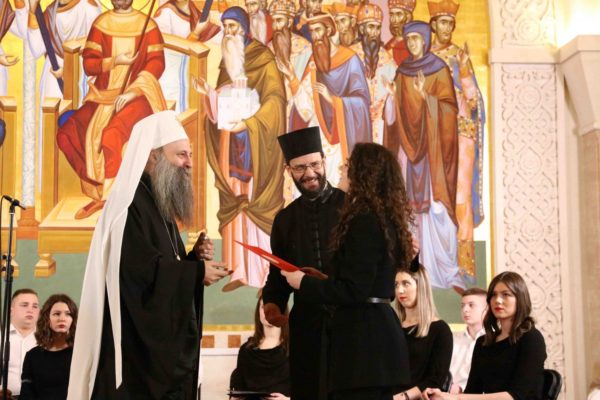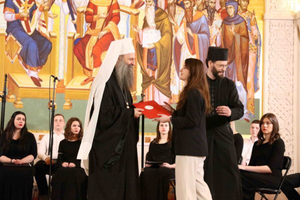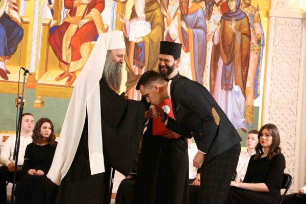 Његова Светост Патријарх српски г. Порфирије уручиo je 12. фебруара 2022. године, на празник Света Три Јерарха,, на пригодној свечаности у крипти храма Светог Саве стипендије студентима завршних година Медицинског, Електротехничког, Правног, Философског и Богословског факултета, који су одабрани на конкурсу.