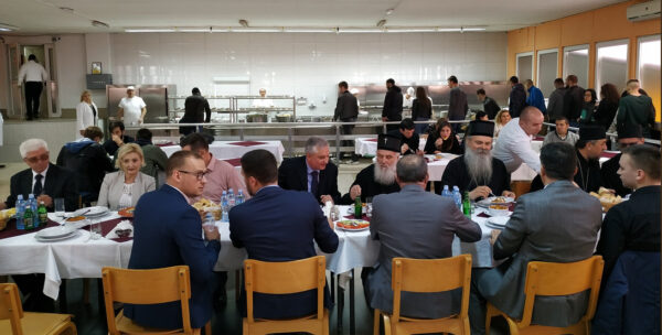 После разговра са професорима и студентима у згради Ректората, патријарх Иринеј је, заједно са владиком Теодосијем и студентима, ручао у студентској мензи.