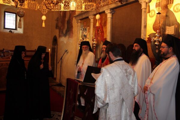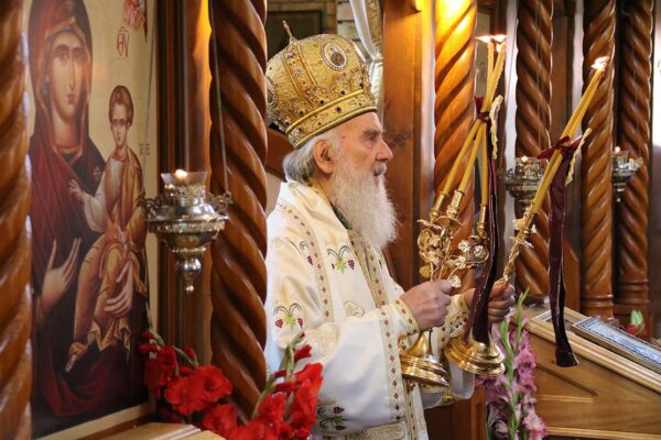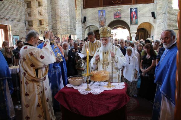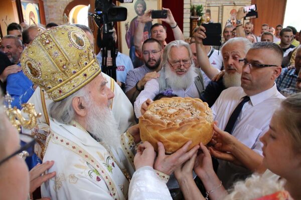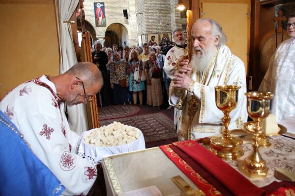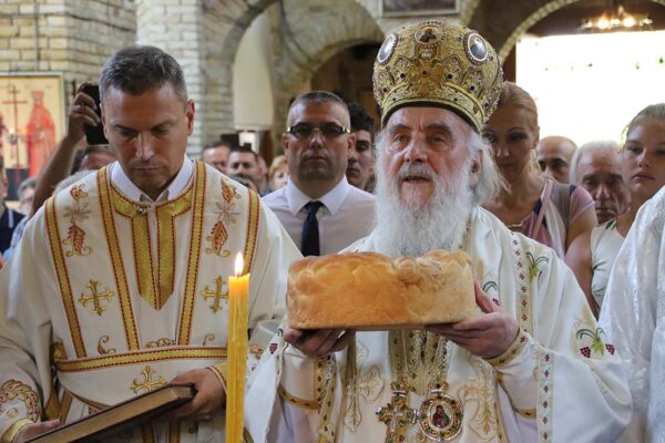 Пред крај Литургије Његова Светост Патријарх је преломио славски колач који је принела породица Ђокић, домаћини славе.