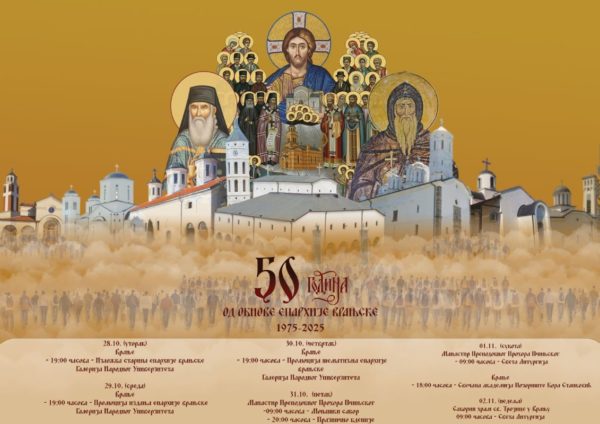 Свечана прослава педесете годишњице од обнове Православне Епархије врањске отпочела је 28. октобра 2025. године, у 19 часова. Прво вече јубилеја било је посвећено изложби старина и драгоцености из богате ризнице Епархије врањске, која сведочи о духовном, културном и уметничком наслеђу ових простора. Промоцију је отворио Његово Високопреосвештенство Митрополит врањски г. Пахомије, који је поздравио све сабране, чиме је званично започела прослава пола века постојања Епархије врањске. О изложби су говорили: протојереј-ставрофор Небојша Стојадиновић и гђа Јелена Атанаcијев, виши кустос Народног музеја у Врању, који су истакли значај очувања светиња и црквених споменика као темеља идентитета нашег народа.