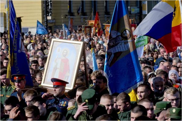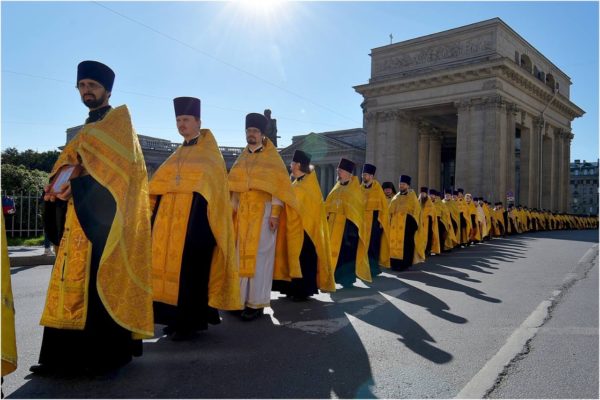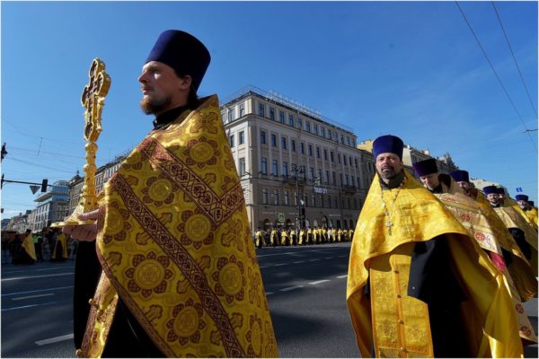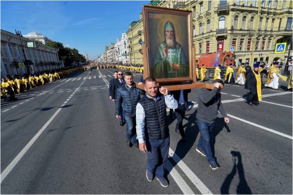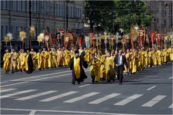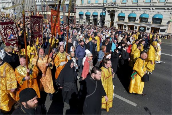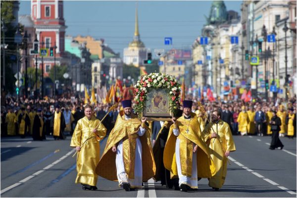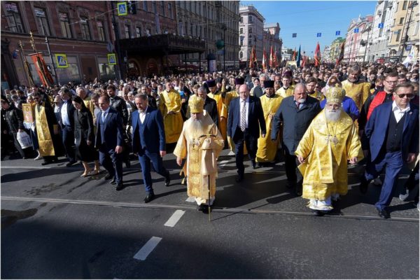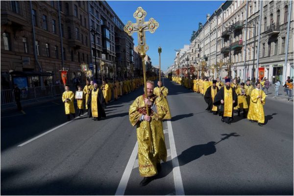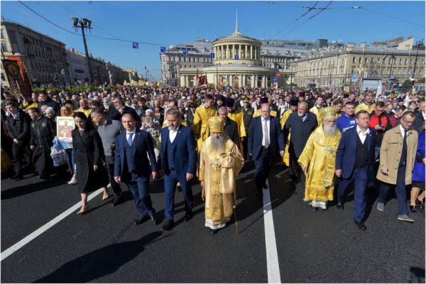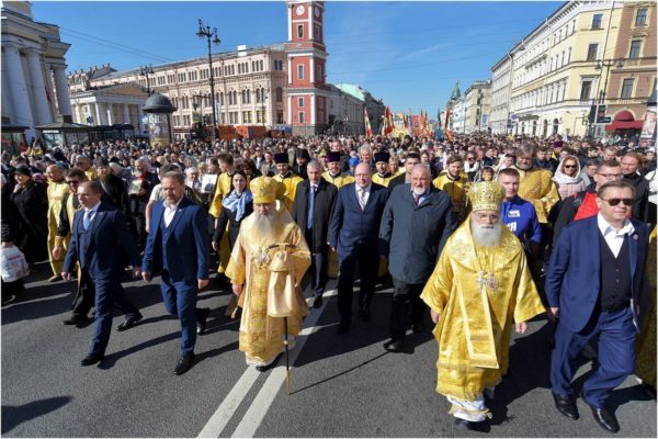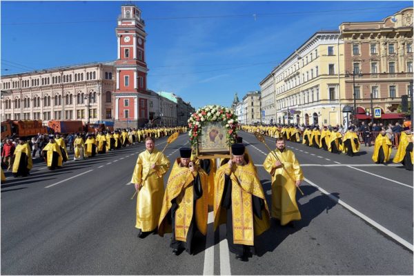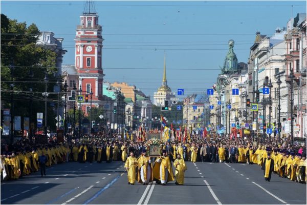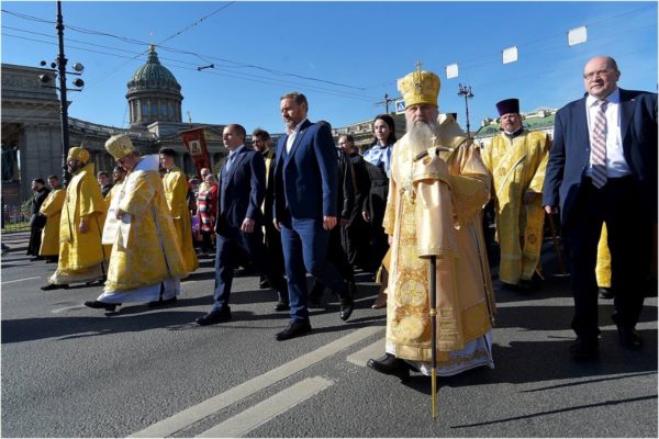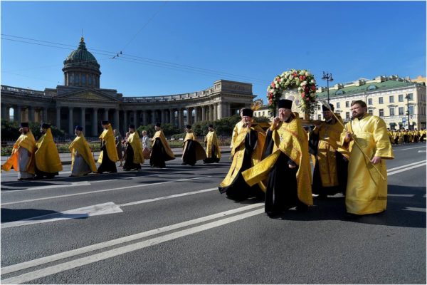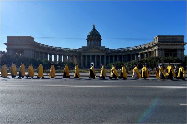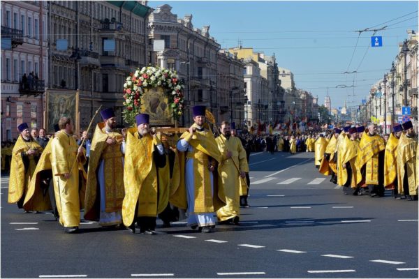 После Божественной литургии состоялся крестный ход по Невскому проспекту с Казанской иконой Божией Матери. В нем участвовали священнослужители митрополии, представители приходов города, области и других регионов, общественных организаций, братств, учащиеся духовных школ, горожане.