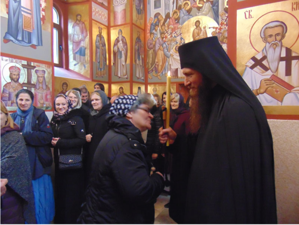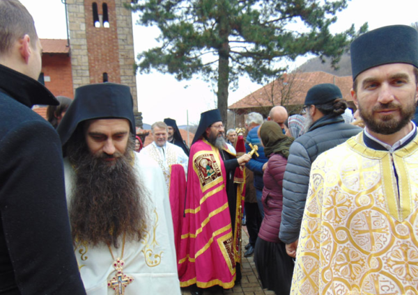 Осврнувши су у беседи на још један догађај који се данас збио у Цркви Божијој, на примање монашког пострига, подсетио је све верне да је монаштво изникло из Цркве. Монах је молитвеник за читав свет, моли се да цео свет прими Духа Светог.