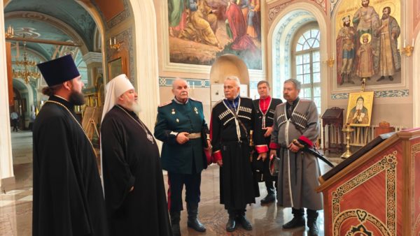 16 июля в храме святителя Николая в Заяицком состоялась встреча председателя Синодального комитета по взаимодействию с казачеством митрополита Ставропольского и Невинномысского Кирилла, и Верховного атамана Общероссийской общественной организации «Союз казаков» Павла Задорожного. Участниками встречи стали ответственный секретарь Синодального комитета, настоятель храма свт. Николая в Заяицком иерей Тимофей Чайкин и офицеры штаба Союза казаков.