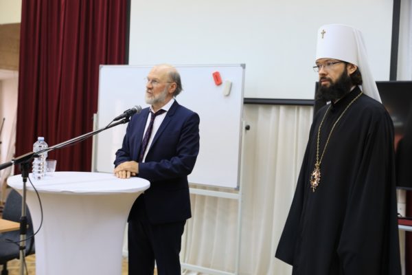 После общей молитвы и приветствия ректора владыка Антоний выступил с лекцией «Православие в международной политике», посвященной актуальному состоянию межцерковных отношений, православному пониманию межрелигиозного диалога, его цели и значению для обеспечения гармоничных межконфессиональных отношений. Председатель ОВЦС отдельно остановился на вопросах защиты канонической Церкви на Украине, подробно рассказав о своем общении с Предстоятелями Православных Церквей относительно преодоления кризиса в межправосланых отношениях.