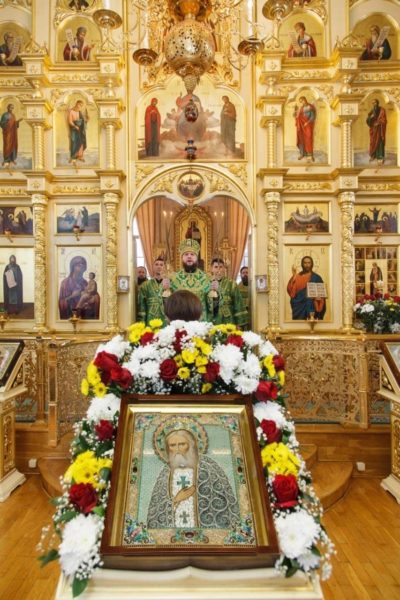 По окончании богослужения у памятника патриарху Пимену была пропета «Вечная память», а у памятника преподобному Серафиму Саровскому совершено славление.