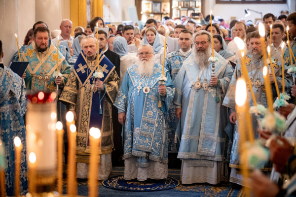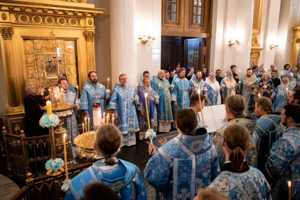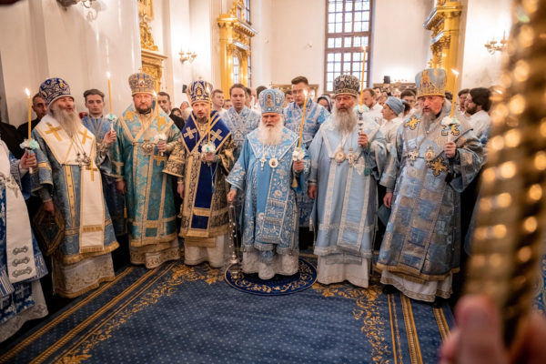 В завершение богослужения архипастыри и священнослужители совершили славление Божией Матери перед Её чтимым Казанским образом.