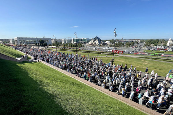 После прибытия крестоходцев в Казанском соборе началась Божественная литургия. Праздничное богослужение совершили глава Cреднеазиатского митрополичьего округа митрополит Ташкентский и Узбекистанский Викентий, Патриарший экзарх всея Беларуси митрополит Минский и Заславский Вениамин, митрополит Казанский и Татарстанский Кирилл, митрополит Белгородский и Старооскольский Иоанн, митрополит Йошкар-Олинский и Марийский Иоанн, митрополит Тверской и Кашинский Амвросий, митрополит Ханты-Мансийский и Сургутский Павел, митрополит Иркутский и Ангарский Максимилиан, митрополит Смоленский и Дорогобужский Исидор, митрополит Волгоградский и Камышинский Феодор, митрополит Челябинский и Миасский Алексий, архиепископ Элистинский и Калмыцкий Юстиниан, архиепископ Гомельский и Жлобинский Стефан, архиепископ Пятигорский и Черкесский Феофилакт, архиепископ Бельцкий и Фэлештский Маркелл, архиепископ Салехардский и Ново-Уренгойский Николай, архиепископ Владикавказский и Аланский Герасим, епископ Моравичский Антоний (Сербская Православная Церковь), епископ Чистопольский и Нижнекамский Пахомий, епископ Альметьевский и Бугульминский Мефодий, епископ Златоустовский и Саткинский Викентий, епископ Аргентинский и Южноамериканский Леонид, епископ Переславский и Угличский Феоктист. Архипастырям сослужили наместники и настоятели монастырей, благочинные церковных округов Казанской епархии, другие клирики.