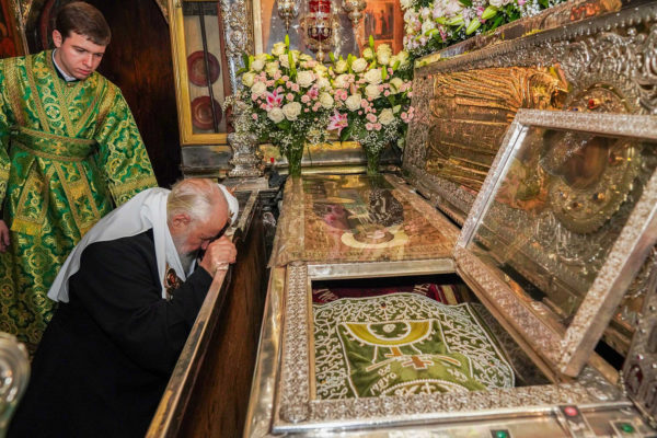 Затем Святейший Патриарх Кирилл поклонился мощам преподобного Сергия Радонежского в Троицком соборе, а также святыням Никоновского придела и Серапионовой палаты.