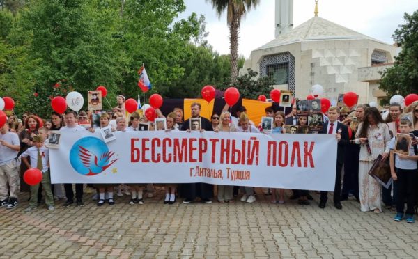В День Победы празднование также состоялось в турецкой Анталье. На территории комплекса «Сад религий» Генеральное консульство Российской Федерации в Анталье при поддержке общин Русской Православной Церкви организовало масштабные мероприятия с участием более 500 соотечественников. Начавшиеся благодарственным молебном, который возглавил священник Алексий Головин в сослужении священника Димитрия Богатыря, торжества продолжились шествием Бессмертного полка, праздничным концертом и тематической выставкой «Лица Великой Отечественной войны». В течение всего дня 9 мая пришедшие на праздник могли также стать зрителями показа короткометражных фильмов о событиях 1941-1945 годов. К собравшимся обратился генеральный консул России в Анталье С.М. Ветрик. Репортаж о празднике был показан в эфире телеканала «Россия 24».