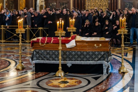 Затем Святейший Патриарх Московский и всея Руси Кирилл и Святейший Патриарх Сербский Порфирий совершили отпевание епископа Моравичкого Антония.