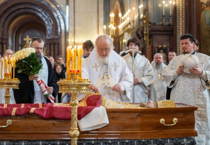 По традиции Святейший Патриарх Кирилл огласил и вложил в руки усопшего грамоту с разрешительной молитвой.