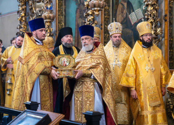 По завершении Литургии Святейший Владыка совершил славление и прочитал молитву у раки с мощами святителя.