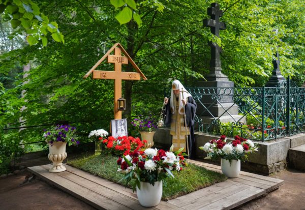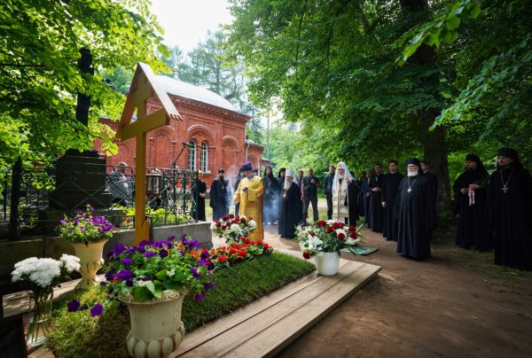 В храме Всех преподобных отцов, в посте и молитве просиявших, на Игуменском кладбище Святейший Владыка совершил молитву и поделился воспоминаниями о том, как приснопамятный митрополит Никодим (Ротов) тайно совершил в стенах храма Литургию — первую после закрытия и разорения Валаамского монастыря.