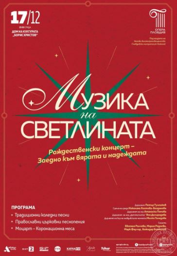 С благословението на Негово Високопреосвещенство Пловдивския митрополит Николай, Държавна опера Пловдив организира „Музика на светлината“ – Рождественски концерт „Заедно към вярата и надеждата“. Концертът ще се проведе на 17 декември (сряда) от 19:00 часа в Дома на културата „Борис Христов“ в Пловдив.