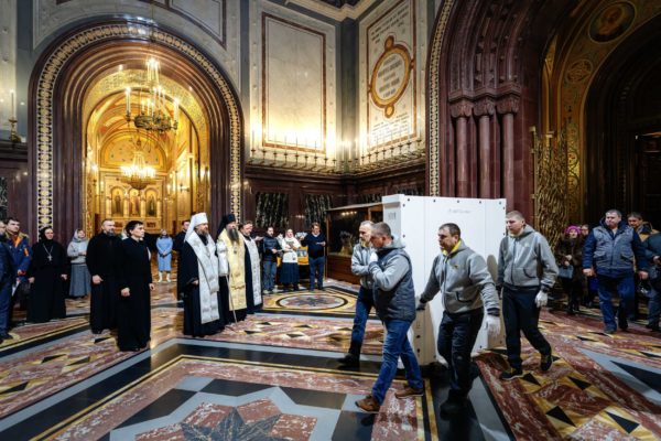 По благословению Предстоятеля Русской Православной Церкви великую святыню в Храме Христа Спасителя встречали: митрополит Воскресенский Григорий, управляющий делами Московской Патриархии, первый викарий Патриарха Московского и всея Руси по городу Москве; епископ Сергиево-Посадский и Дмитровский Кирилл; игумения Ксения (Чернега), руководитель Правового управления Московской Патриархии; духовенство Храма Христа Спасителя.