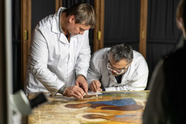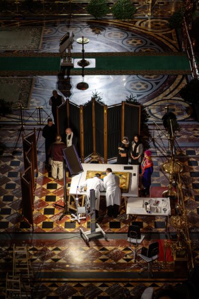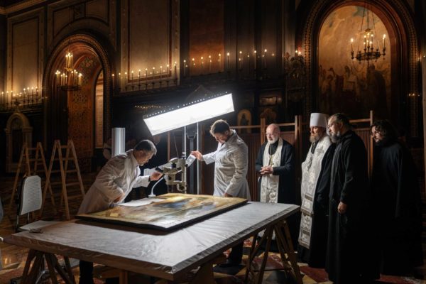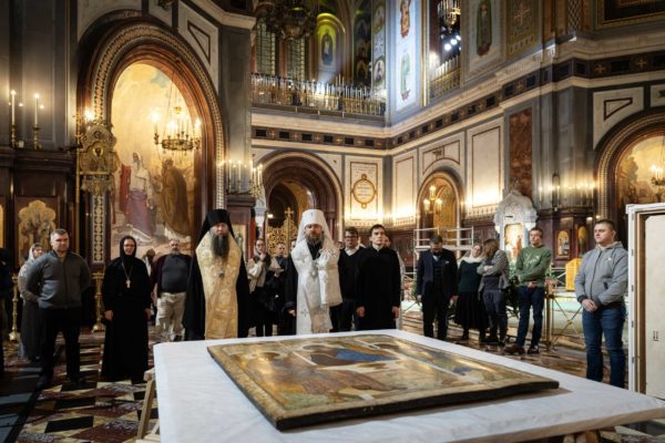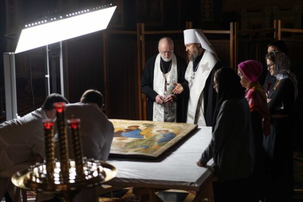 Образ Святой Троицы был доставлен из Всероссийского художественного научно-реставрационного центра имени академика И.Э. Грабаря, где он находился под научным наблюдением в специальном помещении с климат-контролем.