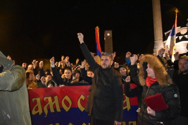 На тргу испред хотела Пљевља најпре су сви саборно прочитали молитву Господњу Оче наш, предвођени Ксенијом Ирић. Затим је парох прибојски протојереј-ставрофор Јово Андан прочитао саопштење пљеваљског Одбора за одбрану светиња и потом се присутнима обратио прота Никола Пејовић, главни и одговорни уредник радија Светигора: