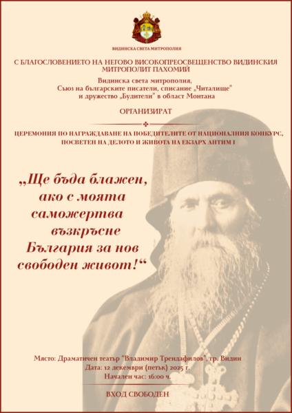 Приключи тазгодишното издание на националния конкурс „Ще бъда блажен, ако възкръсне България за нов свободен живот!”, посветен на живота и делото на екзарх Антим I, организиран с благословението на Негово Високопреосвещенство Видинския митрополит Пахомий от Видинската света митрополия, Съюза на българските писатели, Фондация „Читалище”, списание „Читалище” и дружество „Будители” в област Монтана.