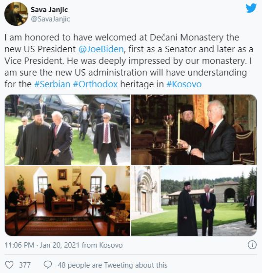 „Бајден је био дубоко импресиониран нашим манастиром“, написао је Јањић.