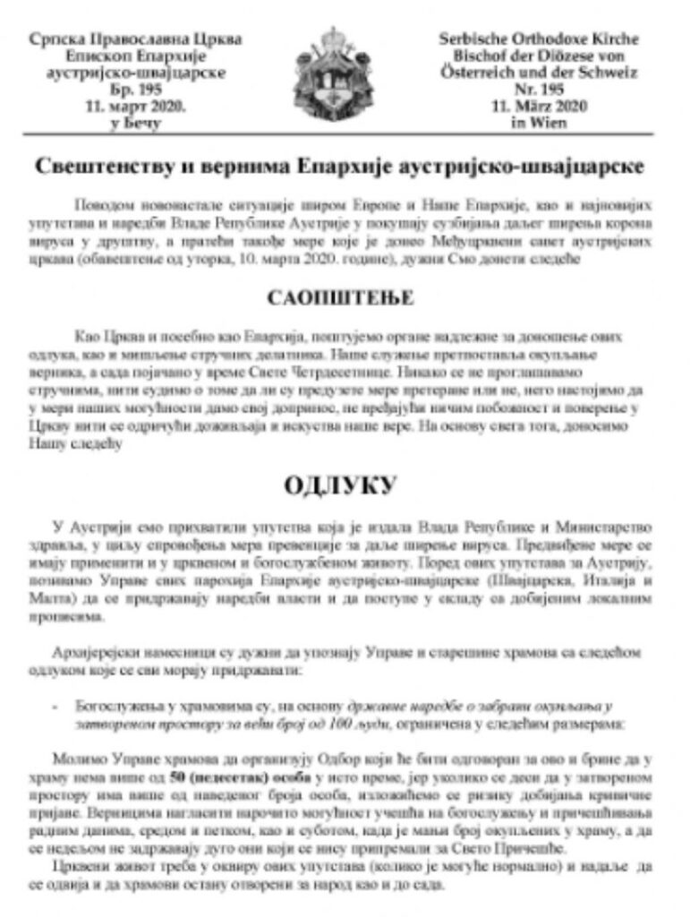 У саопштењу од 11. марта 2020.г. се, између осталог, наводи: „Никако се не проглашавамо стручнима нити судимо о томе да ли су предузете мере претеране или не, него настојимо да у мери наших могућности дамо свој допринос, не вређајући ничин побожност и поверење у Цркву нити се одричући доживљаја и искуства наше вере“. На основу свега изнетог у Саопштењу, које се налази на страници Епархије аустријско-швајцарске, донета је одлука у којој стоји: „У Аустрији смо прихватили упутства која је издала Влада Републике и Министраство здравља, у циљу спровођења мера превенције за даље ширење вируса (државна наредба о забрани окупљања у затвореном простору за већи број од 100 људи). Предвиђене мере се имају применити и у црквеном и богослужбеном животу. Поред ових упутстава за Аустрију, позивамо Управе свих парохија Епархије аустријско-швајцарске (Швајцарска, Италија и Малта) да се придржавају наредби власти и да поступе у складу са добијеним локалним прописима“. Посебно се у овој одлуци наглашава следеће: „Све ово не указује на могући страх од причешћивања него на настојање да се заштитимо од опасности којима смо изложени при масовним окупљањима“. Одлуку Епархије аустријско-швајцарске по овом питању налази се на следећем линку: http://www.crkva.at/%d0%b2%d0%b0%d0%bd%d1%80%d0%b5%d0%b4%d0%bd%d0%be-%d1%81%d0%b0%d0%be%d0%bf%d1%88%d1%82%d0%b5%d1%9a%d0%b5-%d0%b5%d0%bf%d0%b0%d1%80%d1%85%d0%b8%d1%98%d0%b5/