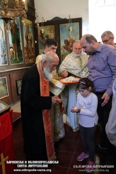 Веднага след светата Литургия последва водосвет и освещаване на приготвения благодарствен дар, който бе раздаден на присъстващите. Ставрофорен иконом Петър Георгиев и протойерей Георгий Стоименов поздравиха всички присъстващи.