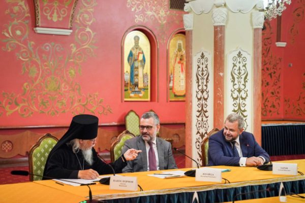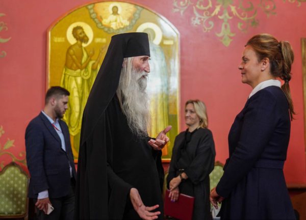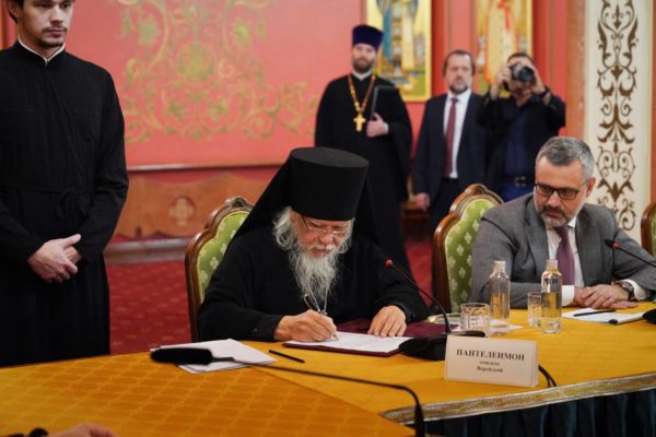Далее состоялась церемония подписания Соглашения о сотрудничестве и взаимодействии между Синодальным отделом по церковной благотворительности и социальному служению и Государственным фондом поддержки участников специальной военной операции «Защитники Отечества». Документ подписали епископ Верейский Пантелеимон и А.Е. Цивилева.