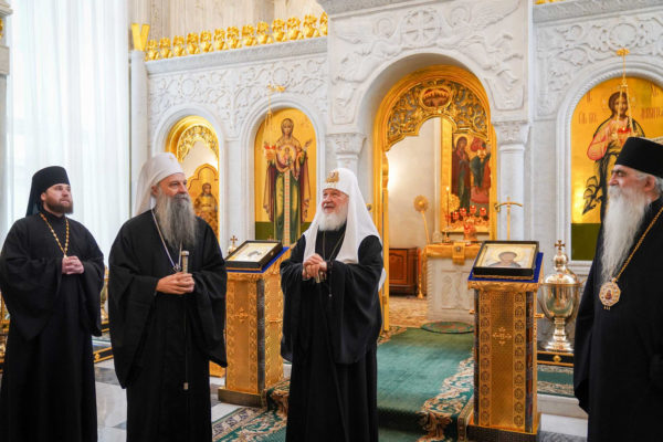 Сербский Патриарх Порфирий передал в дар главе Русской Церкви тройник (две панагии и крест).