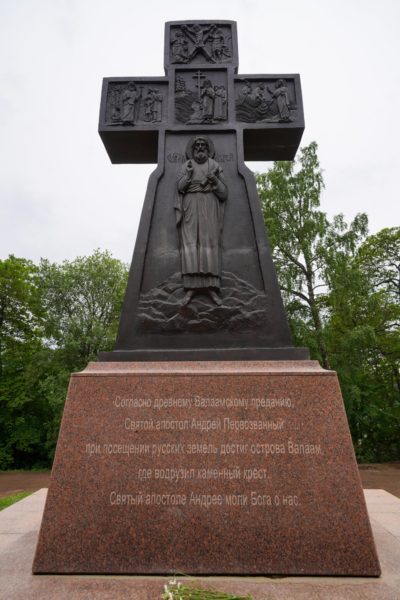 «Согласно древнему Валаамскому преданию, святой апостол Андрей Первозванный при посещении русских земель достиг острова Валаам, где водрузил каменный крест. Святый апостоле Андрею моли Бога о нас»;