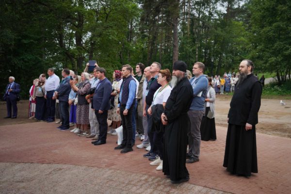 На освящении креста присутствовали: наместник Валаамского монастыря епископ Троицкий Панкратий, председатель Попечительского совета Фонда Андрея Первозванного В.И. Якунин, директор Фонда Андрея Первозванного В.В. Бушуев, председатель Совета директоров АО «НПО Ангстрем» Л.Д. Рейман, генеральный директор АО «Борисфен» П.И. Кононенко, насельники Валаамского монастыря, паломники.