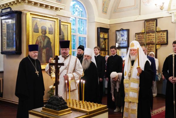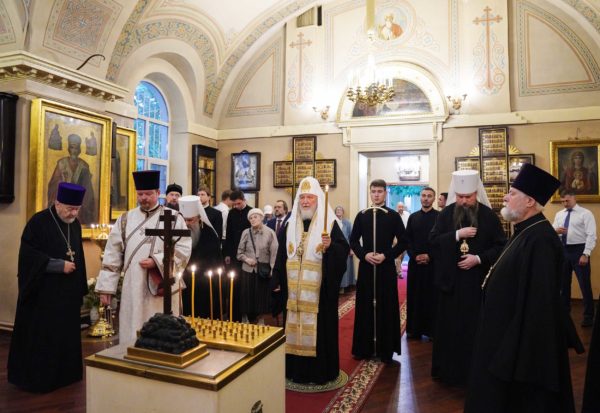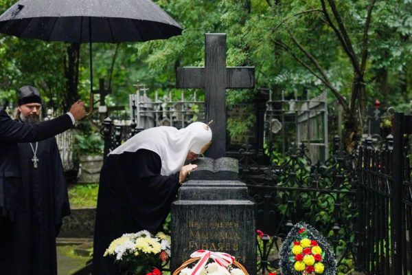 Затем Предстоятель Русской Церкви направился на Большеохтинское кладбище Санкт-Петербурга, где совершил литию в Никольском храме по своим благочестивым родителям — протоиерею Михаилу и Раисе Владимировне Гундяевым и возложил цветы к их могилам.