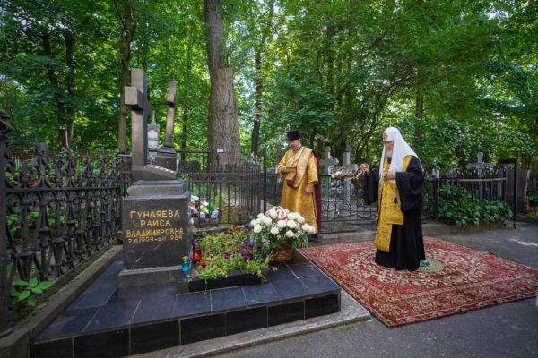Затем Предстоятель Русской Церкви направился Большеохтинское кладбище Санкт-Петербурга, где совершил литию на месте погребения своих благочестивых родителей — протоиерея Михаила и Раисы Владимировны Гундяевых и возложил цветы к их могилам.