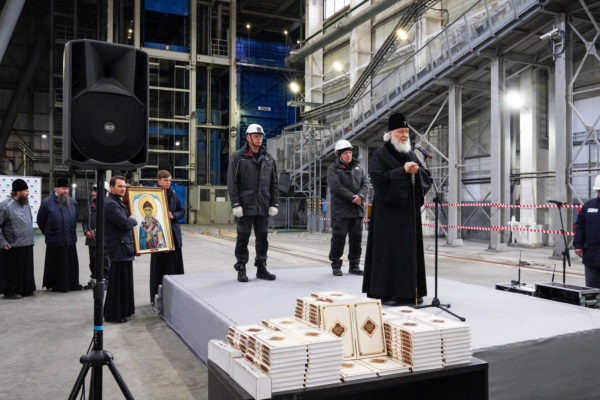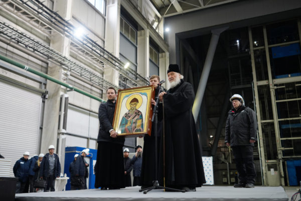 В дар руднику Святейший Патриарх Кирилл передал икону святителя Спиридона Тримифунтского, сотрудникам предприятия — иконки Христа Спасителя с Патриаршим благословением и сборники своих проповедей.
